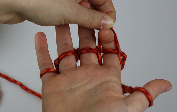 - Beim Ringfinger machst Du genauso weiter: Lege den unten liegenden Wollfaden über den oben liegenden Wollfaden und stülpe ihn über die Fingerspitze.