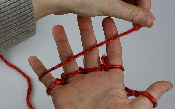 - Lege den Faden um den Zeigefinger herum und führe ihn hinter sämtlichen Fingern durch.