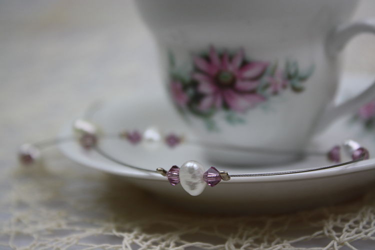 - Jetzt fädelst Du eine violette Swarovski-Perle auf. Es folgen eine Glasperle und wieder eine Swarovski. Zuletzt schibest Du eine Quetschperle auf den Draht.